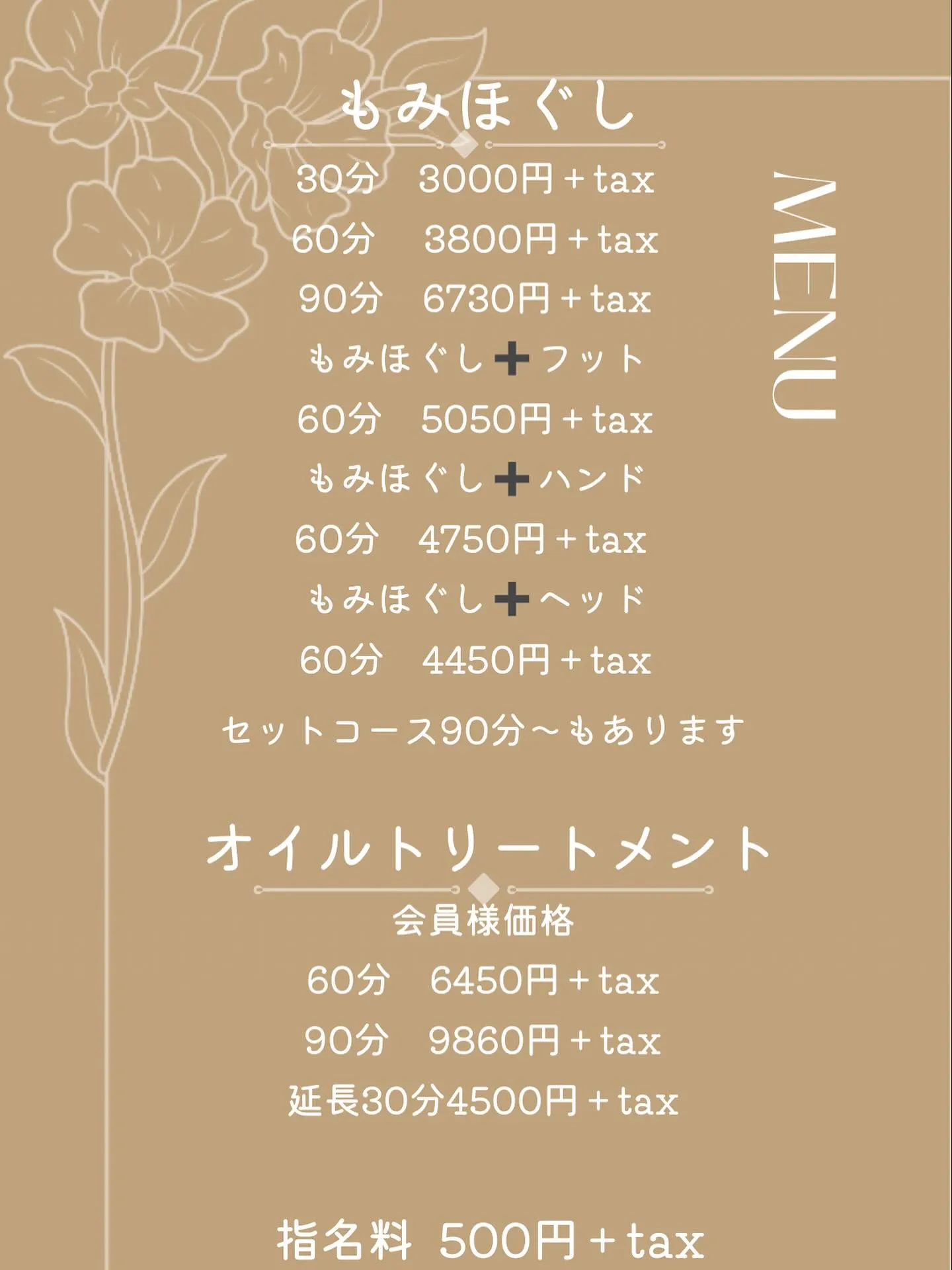 料金についてですが、スタッフ増員で供給が安定したこともあり再度見直しを行い、もみほぐし60分4180円の価格に再設定することができましたのでお知らせいたします。