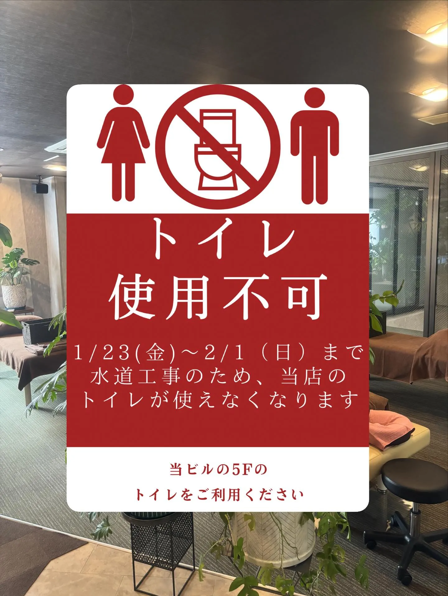 1/23(金)~2/1(日)まで、当ビルの水道工事のため 2026/01/22 1/23(金)~2/1(日)まで、当ビルの水道工事のため もみほぐし亭でのトイレ使用が不可になります 当ビルの5階のトイレをご利用ください 皆様には大変ご迷惑をおかけ致しますが ご理解ご協力の程よろしくお願いいたします🙇♀️
